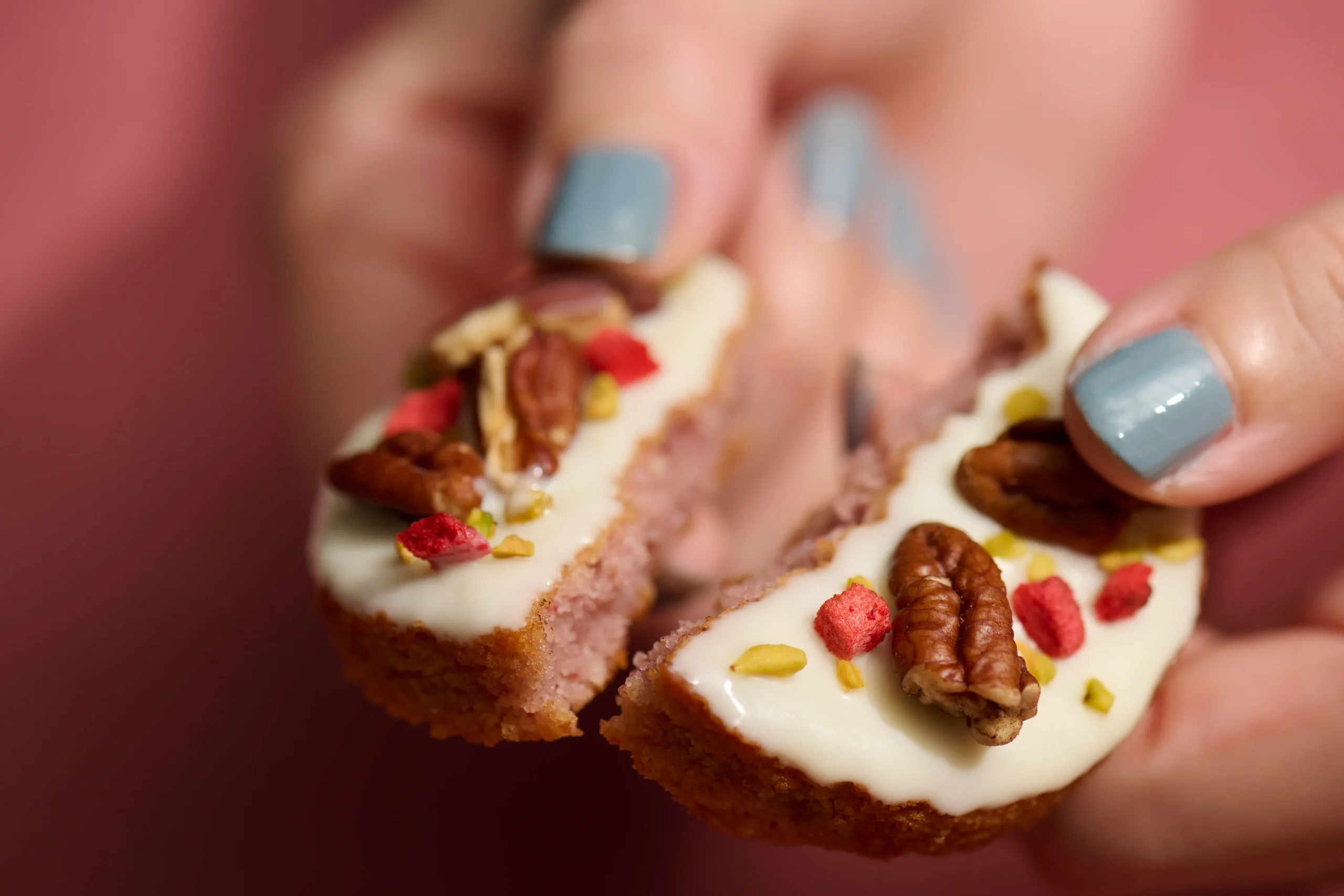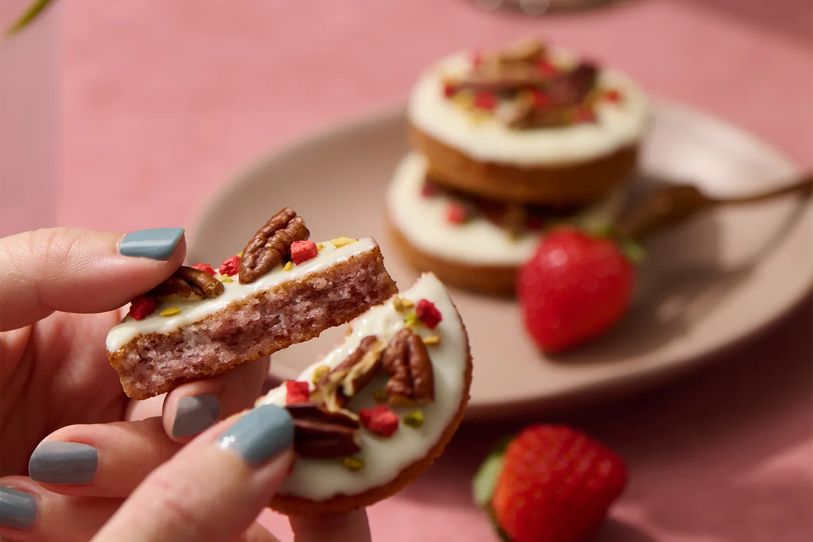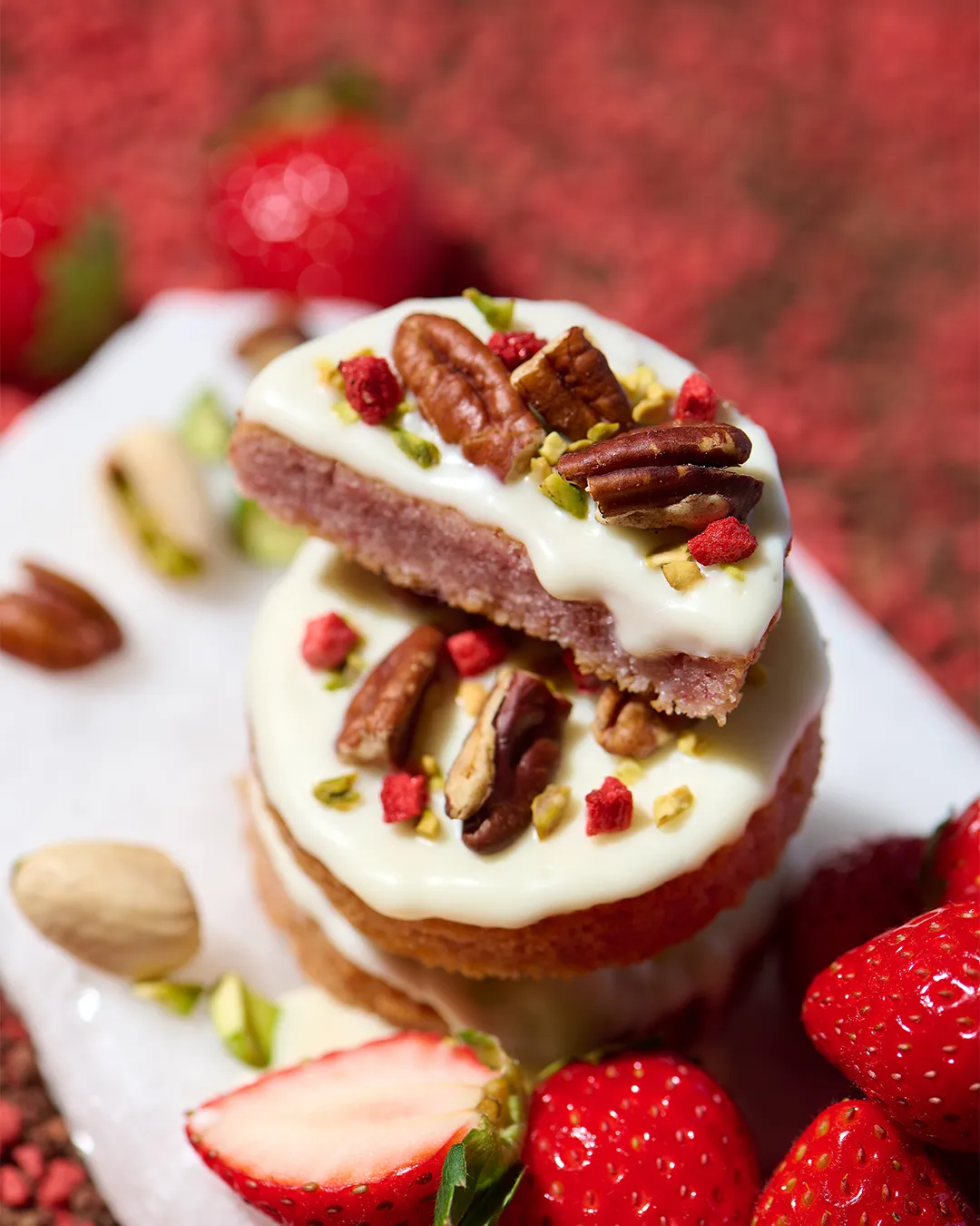 まろやかなホワイトチョコレートに、ごろっとしたピーカンナッツと砕いたピスタチオ、ストロベリーをトッピング。 多重奏のような食感と彩りを加えました。